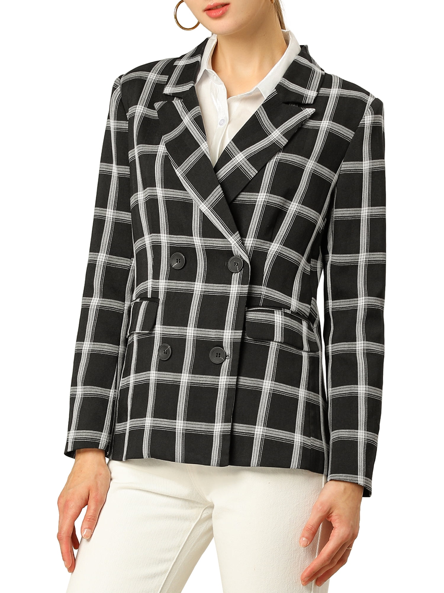 Allegra K Women S Notched Lapel Double Breasted Plaid Blazer Jacket Walmart Com